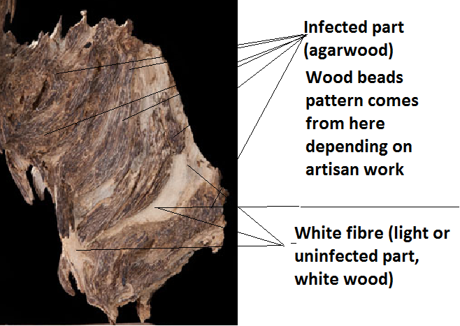 Compare the cultivated agarwood fragments (large drilled hole, open) with the picture below.
