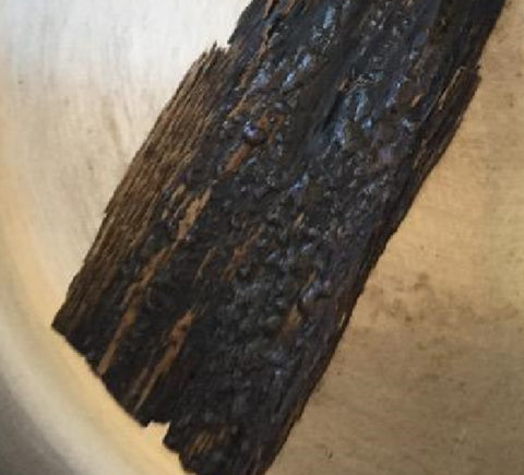 (The above picture shows the heated resin. The surface appears blackened and shiny due to the oils in the wood, which are released at high temperatures, emitting a woody fragrance)